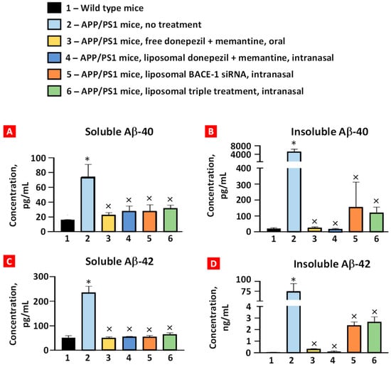 The concentration of soluble (A) and insoluble (B) Aβ40 and soluble (C) and insoluble (D) Aβ42 peptides in brain tissues. Please note that the ordinate scale in (D) has been changed to ng/mL. Means ± SD are shown. * p < 0.05 when compared with wild-type mice (bar 1); × p < 0.05 when compared with APP/PS1 mice, no treatment (bar 2) (n = 3).