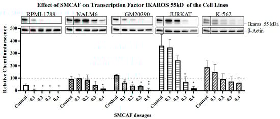 T and CML Cell lines: The control cell lines Jurkat and K562 do not have the expression of the PAX5 transcription factor. In the Jurkat cell line, upon exposure to the SMCAF, transcription factor Ikaros 55 kD downregulated; however, with doses of 0.1 to 0.2 mg/mL, this was not significant (p = 0.9016 and 0.3031, respectively). A considerable downregulation was noted with doses of 0.3 and 0.4 mg/mL (p = 0.0453 and p = 0.0214, respectively) (Figure 3). The transcription factor Ikaros 55 kD in K-562 cells showed no statistically significant changes with any doses of the SMCAF (Figure 3). In the Jurkat line, the addition of SMCAF resulted in a very gradual downregulation of the transcription factor Ikaros 75 kD, and only with doses of 0.3 and 0.4 mg/mL did the downregulation become significant (p = 0.0037 and p = 0.0003, respectively) (Figure 4). Similarly, the Ikaros 75 kD level in the K562 cell line was gradual, and it was only significantly downregulated with SMCAF doses of 0.3 and 0.4 mg/mL (p = 0.0425 and p = 0.0313) (Figure 4). The downregulation of NF-κB p65 in the Jurkat cell line was only significant with SMCAF doses of 0.3 and 0.4 mg/mL (p = 0.0051 and p = 0.0003, respectively). In the K-562 cell line, with all SMCAF doses used, the NF-κB p65 level was not significantly altered (p > 0.29) (Figure 5).