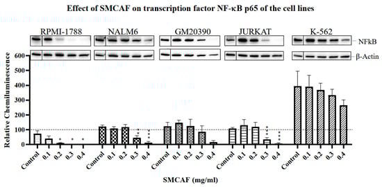In our studies, upon exposure to SMCAF, downregulation of NF-κB was noted, on a dose-dependent basis, in all cell lines, except K562 (Figure 4). This downregulation was most notable in RPMI-1788, where smaller doses of SMCAF resulted in the total elimination of NF-κB. In the Pre-B and B-cell cell lines, while the levels of this transcription factor steadily declined with doses of 0.3 mg/mL and 0.4 mg/mL of SMCAF (p = 0.062 and p = 0.001, respectively), it was not completely eliminated with the highest doses utilized. Of interest is that, in the K562, a CML cell line, there was no statistically significant decline in the levels of NF-κB p65, even with the highest dose of SMCAF, i.e., 0.4 mg/mL used (Figure 4). Constitutive activation of NF-κB complexes has been reported in most (39/42) ALL patients without subtype restriction [].