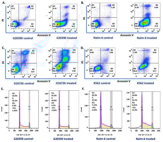 Upon exposure to SMCAF, analyses revealed notable changes in the leukemic cell lines. The results of the apoptosis studies, conducted with annexin V/PI staining, showed that there was a significant increase in the early apoptosis in the GM20390, NALM6, and K562 cell lines after 72 h of treatment with the SMCAF (Figure 6A,B,D). In addition, a significant increase in late apoptosis was observed in the cell line GM16726 after the treatment (Figure 6C). Cell cycle analysis was performed after 72 h of supernatant in the culture of the mycovirus-containing Aspergillus flavus treatment. An increase in the G1 phase was observed in the GM20390 cell line (33.9% to 41.6%) (Figure 6E). In addition, an increase in the S phase was noted in the NALM6 (47.9% to 55.7%) cell line (Figure 6F). No changes were observed in the control cell lines. Corroboration of apoptotic cell death was observed while analyzing the cell cycle, in the increase in cells in G0 after treatment with the supernatant of the culture of mycovirus-containing Aspergillus flavus in NALM6 Jurkat cells. (Representative data from 2 independent experiments). Of course, the apoptosis and cell cycle studies were preliminary studies and not subject to statistical evaluations.