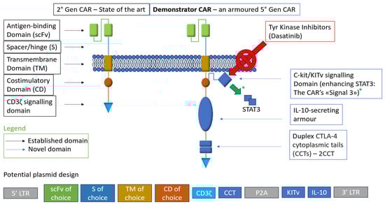 Providing multiple types of costimulation is the basis of third- and fifth-generation constructs, respectively providing the same type of third stimulatory signal (via a second costimulatory domain) or providing a different third signal (canonically cytokine signaling through JAK–STAT3/5 [39]). To date, these efforts have achieved variable results, hampered by dysfunctional CAR T cells and/or higher cytokine-induced toxicity [40,41]. By integrating KITv, a mutation that allows c-Kit signaling activation independently of its ligand, a fifth-generation CAR construct has been recently reported. c-Kit, also known as CD117, is a type-III receptor tyrosine kinase expressed in stem cell populations and essential for the development of several cell types such as erythrocytes and germ cells [42]. Physiologically, c-Kit signaling is a key driver of T cells’ ability to proliferate and differentiate, though T cells downregulate this pathway during differentiation [43]. The D816V mutation c-Kit’s activating loop (KITv) constitutively triggers c-Kit signaling [44,45,46,47], acting as signal 3 of costimulation and insulating the CAR T cell from immunosuppressing signals within the TME. The construct exhibited remarkable efficacy in tumors with transforming growth factor-β (TGFβ)-induced immunosuppression, as well as low-antigen expression. TGFβ is one of the main immunosuppressive cytokines in solid tumors such as mesothelioma and lung cancer [48,49,50,51]. Another approach to deal with TGFβ that should be briefly mentioned is the use of a dominant-negative transforming growth factor-beta receptor 2 (TGFβRII) (DNTGFβRII), since it has already been reported at the clinical level, demonstrating feasibility [52] DNTGFβRIIs can block TGFβ signaling, so that CAR T cells can remain activated and proliferate effectively. Ideally, c-Kit would surpass the improvement in efficacy resulting from approaches like this, though one of its potential limitations, and the reason why it is downregulated in mature cells, is its correlation with tumorigenesis [53,54,55,56]. which may happen in the case of c-Kit signaling dysregulation/gain-of-function mutations. In the study, KITv CAR T cells reportedly could not proliferate in the absence of antigen activation, supporting the article’s safety claim [57]. Moreover, since c-Kit is a receptor tyrosine kinase, KITv CAR T cells are highly sensitive to market-authorized tyrosine kinase inhibitors (Dasatinib), providing a novel safety switch approach [58].