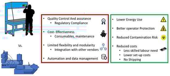 The development of new CAR constructs often starts on a small scale. Heterologous production mimics traditional pharmaceutical manufacturing, but the production of autologous, bespoke therapies requires innovative scaling solutions, typically using closed systems. These systems employ semi-automated machinery and single-use components, isolating the biological material from the operator and offering a cleaner environment comparable to grade A facilities (cleanrooms), even in lower-grade settings. This design minimizes contamination risks and operator exposure to hazardous materials, potentially reducing cleanroom-related costs and logistics [98,99]. These factors contribute to more sustainable operations, reducing energy consumption, easing the burden on operators, and shortening patient wait times. In EU, compliance with GMPs for these automated systems is supported by specific EU guidelines for ATMPs [100,101]. Since adopting distributed manufacturing is crucial for scaling up personalized therapies affordably and supports local production during clinical trials, automation seem to be the correct path as it promotes reproducibility and cost-efficiency by reducing manual steps and the need for specialized workforce and cleanroom facilities, also speeding up the production. However, challenges such as the cost of consumables, equipment incompatibility, and potential supply shortages remain. The limitations of closed systems available on the market versus their potential benefits are illustrated in Figure 3.