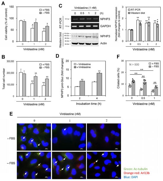 The anticancer effect of vinblastine (VBL) decreased under serum-deprived (SD) conditions and was associated with primary cilium formation and NPHP3 expression. (A–C) HeLa cells were incubated with various VBL concentrations in the presence or absence of fetal bovine serum (FBS) for 24 h. Cell viability was measured by trypan blue exclusion assay (A). Cell number was counted by using a hemocytometer (B). Total RNA in the cells incubated under SD condition was prepared by using NucleoZOL® and the expression level of NPHP3 was measured by RT-PCR (C left top). Cell lysates in the cells incubated under SD conditions were prepared and each protein was detected by western blot analysis (C left bottom). The density of NPHP3 amount in the VBL-treated group was quantitated with NIH image analysis software (version 1.54h) and normalized to control. Fold changes in NPHP3 were represented with a bar graph (C right). (D) HeLa cells were transfected with pEZX-PG02-NPHP3-promoter (pmt) Gaussia luciferase (Gluc) plasmid and incubated in the presence or the absence of FBS for up to 24 h. The activity of Gluc in cultured media was measured with a luminometer using a Gluc substrate. (E,F) HeLa cells were incubated with VBL in the presence or absence of FBS for 24 h. The cells were fixed and stained with antibodies against Ac-tubulin (green) and Arl13b (orange-red). The nucleus was stained with DAPI (blue). The primary cilium was observed and photographed at 400× or 1000× magnification with 40× or 100× objectives, respectively under a fluorescence microscope. The image with primary cilia at 1000× magnification is representative of ≈30 pictures. White arrows indicated primary cilia (E). The ciliated HeLa cells (n > 500 cells) in the presence (white) or absence (grey) of FBS were counted (F). Data were representative of four experiments. Processing (such as changing brightness and contrast) is applied equally to control across the entire image (C left, E). Data in bar graphs represents the means ± SEM. * p < 0.05, ** p < 0.01; significantly different from VBL-untreated control group in the presence of FBS (A,B,C right, D,F). & p < 0.05, && p < 0.01; significantly different from the control group in the presence of FBS at each concentration (A,B,F).
