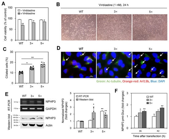 We examined whether PC formation is associated with the induction of VBL resistance. When wild-type (WT) HeLa cells were treated with VBL once or repeatedly three (3×) to five (5×) times, cell death was inhibited by repetitive treatments, with viability increasing to ≈80% and 85% in 3× and 5× VBL-treated cells, respectively, compared to ≈66% in single-treated WT control, which was determined by the trypan exclusion assay (Figure 2A,B). PC frequency, respectively, increased by repetitive treatments 1.4 and 1.8 times in 3× and 5× VBL-treated cells compared to WT control, which was determined by immunostaining (Figure 2C,D). Transcript and protein levels of NPHP3 also increased in 3× and 5× repeatedly VBL-treated cells compared to WT control, which was determined by RT-PCR (Figure 2E left top and right) and western blot analysis (Figure 2E left bottom and right), respectively, and confirmed by an increase in NPHP3-promoter activity (Figure 2F). These results suggest that PC formation might regulate VBL resistance induction.