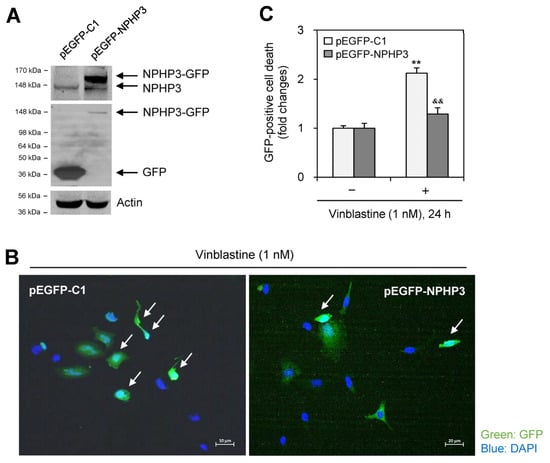 We tested whether NPHP3 expression is associated with the induction of VBL resistance. When NPHP3 was overexpressed by transfection with pEGFP-NPHP3 plasmid in the presence of FBS (Figure 3A), cell death as judged by nuclear condensation was reduced in the GFP-positive cell population (Figure 3B,C). These data indicate that NPHP3 increased drug resistance by decreasing cancer cell responsiveness to VBL.