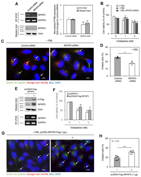 We next tested the effect of NPHP3 knockdown on PC formation. The inhibition of NPHP3 expression by NPHP3-siRNA was confirmed by RT-PCR (Figure 4A left top and right) and western blotting (Figure 4A left bottom and right). The cell viability of ≈70% by 1 nM VBL treatment in the presence of FBS was increased to ≈86% under SD conditions and then reduced to ≈77% by NPHP3-siRNA in the absence of FBS (Figure 4B). PC frequency was reduced by ≈33% by the knockdown of NPHP3 (Figure 4C,D). Overexpression of NPHP3 was confirmed by western blotting and RT-PCR (Figure 4E). The cell viability of ≈50% and ≈40% by 1 and 2 nM VBL treatment in the presence of FBS increased to ≈70% and ≈52% with NPHP3 overexpression (Figure 4F). NPHP3 overexpression approximately doubled the number of ciliated cells (Figure 4G,H). No change in primary cilium length was observed by NPHP3 overexpression (Supplementary Figure S2A). In addition, although SD conditions reduced cell proliferation compared to incubation in the presence of FBS, no change in cell proliferation was detected in the NPHP3-overexpressed group (Supplementary Figure S2B). Therefore, these data suggest that NPHP3 expression could modulate cell death by the anticancer agent, VBL, via PC formation in tumor cells.