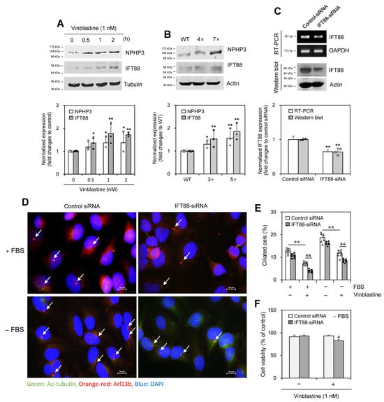 As IFT88, a ciliary maintenance protein, is one of the subunits of the IFT-B complex [,], we examined the ability of IFT88 to control PC formation in response to VBL treatment. IFT88 expression increased in response to VBL treatment for 0.5~2 h along with NPHP3 expression (Figure 5A). In addition, expression of IFT88 protein increased in HeLa cells treated with VBL once or repeatedly four (4×) to seven (7×) times (Figure 5B). IFT88 knockdown by IFT88-siRNA reduced IFT88 transcript (Figure 5C, upper top and lower) and protein (Figure 5C upper bottom and lower). IFT88 knockdown decreased PC frequency in VBL-untreated control cells (Figure 5D,E). IFT88 knockdown decreased PC frequency by ≈50% and 30% in the presence and absence of FBS, respectively, in VBL-treated cells (Figure 5E). Also, cell viability by 1 nM VBL treatment was reduced by ≈10% by the knockdown of IFT88 in the presence of FBS (Figure 5F). These results suggest that IFT88 could be associated with NPHP3 for PC formation in response to VBL treatment both in the presence of FBS and in SD conditions in the absence of FBS.