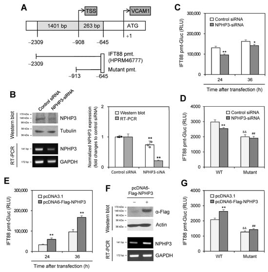 NPHP3 regulated intraflagellar transport protein 88 (IFT88) expression. (A) Pre-designed IFT88 promoter (HPRM46777) was obtained from GeneCopoeia Inc. The mutant IFT88 promoter (pmt) was prepared by the deletion of 1396 bp (−2308~−912). (B–D) AccuTarget™ negative control siRNA or IFT88-siRNA were co-transfected with pEZX-PG02-IFT88-wildtype (WT)-pmt-Gaussia luciferase (Gluc) plasmids (C,D) or pEZX-PG02-IFT88 mutant-pmt-Gluc plasmids (D) into HeLa cells. Cells were incubated for 24 h (B–D) or 36 h (C). Cell lysates were prepared and IFT88 protein was detected by western blot analysis (B left top). Expression level of NPHP3 transcripts was measured by RT-PCR (B left bottom). The density of NPHP3 amount in the NPHP3-siRNA-transfected group was quantitated with NIH image analysis software (version 1.54h) and normalized to control. Fold changes in NPHP3 were represented with a bar graph (B right). The activity of Gluc in cultured media was measured with a luminometer using a Gluc substrate. (C,D). (E–G) pcDNA3.1 or pcDNA6-Flag-NPHP3 plasmids were co-transfected into HeLa cells with pEZX-PG02-IFT88-WT-pmt-Gluc plasmids (E,G) or pEZX-PG02-IFT88 mutant pmt-Gluc plasmids (G). Cells were incubated for 24 h (E–G) or 36 h (E). Cell lysates were prepared and flag protein was detected by western blot analysis (F, top). The expression level of NPHP3 transcripts was measured by RT-PCR (F bottom). The activity of Gluc in cultured media was measured with a luminometer using a Gluc substrate. (E,G). Data were representative of four experiments. Processing (such as changing brightness and contrast) is applied equally to control across the entire image (B left, F). Data were representative of four experiments. Data in bar graphs represents the means ± SEM (B right, C,D,E,G). * p < 0.05, ** p < 0.01; significantly different from control siRNA-transfected group (B right, C,D) or pcDNA3.1-transfected group at each time point (E,G). && p < 0.01; significantly different from WT IFT88-pmt plasmid-transfected and control siRNA-transfected (D) or pcDNA3.1 plasmid-transfected group (G). ## p < 0.01; significantly different from WT IFT88-pmt plasmid-transfected and NPHP3-siRNA-transfected (D) or pcDNA6-Flag-NPHP3 plasmid-transfected group (G).