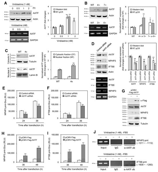 Apoptosis-antagonizing transcription factor (AATF) enhanced the expression of NPHP3 and IFT88. (A,B) Wildtype (WT) HeLa cells were treated with various concentrations of VBL once (A) or repeatedly with VBL three (3×) to seven (7×) times (B). Cell lysates from WT, 4× or 7× cells were prepared and each protein was detected by western blot analysis (A,B top). Expression level of AATF transcripts in WT, 3× or 6× cells was measured by RT-PCR (A,B bottom). (C) Cytosolic or nuclear fractions were separated from WT or 4× cells treated with VBL repeatedly four times. AATF protein was detected by western blot analysis. (D–F) AccuTarget™ negative control siRNA or AATF-siRNA were co-transfected into HeLa cells (D) with pEZX-PG02-NPHP3-pmt Gaussia luciferase (Gluc) plasmids (E) or pEZX-PG02-IFT88-pmt-Gluc plasmids (F). Cell lysates were prepared and each protein was detected by western blot analysis (D left top). The expression level of each transcript was measured by RT-PCR (D left bottom). The density of each protein and transcript was quantitated with NIH image analysis software (version 1.54h) and normalized to control. Fold changes in each protein were represented with a bar graph (A–D right). Cells were incubated for 24 or 36 h. The activity of Gluc in cultured media was measured with a luminometer using Gluc substrate (E,F). (G–I) pCMV-Flag or pCMV-Flag-AATF plasmids were co-transfected into HeLa cells with pEZX-PG02-NPHP3-pmt-Gluc plasmids (H) or pEZX-PG02-IFT88-pmt-Gluc plasmids (I). Cells were incubated for 24 or 36 h. Cell lysates were prepared and flag protein was detected by western blot analysis (G). The activity of Gluc in cultured media was measured with a luminometer using a Gluc substrate (H,I). (J) HeLa cells were incubated in the presence or the absence of 1 nM VBL for 1 h under serum-starved conditions. Cells were fixed with 10% formaldehyde. Their chromatin extracts were immunoprecipitated with anti-AATF antibodies (α-AATF ab). DNA fragments were subjected to PCR analysis using primer sets spanning each promoter (pmt) region. Data were representative of four experiments. Processing (such as changing brightness and contrast) is applied equally to control across the entire image (A–E left, G, J). Data in bar graphs represents the means ± SEM (A–D right, E,F,G,I). * p < 0.05, ** p < 0.01; significantly different from VBL-untreated control (A, right) or WT cells (B right) or nuclear fraction (C right) or control siRNA-transfected (D right, E,F) or pCMV-Flag plasmid-transfected (H,I) group.