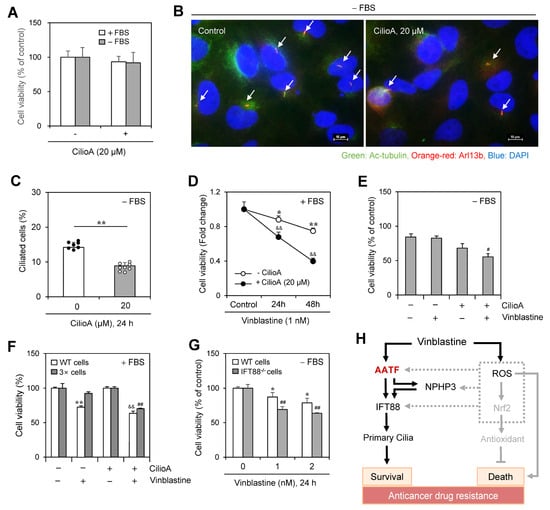 We determined the number of cells with PC using ciliobrevin A (CilioA), a well-known ciliogenesis inhibitor. Little change in cell viability was observed by the treatment with CilioA (Figure 8A) and the frequency of PC in the absence of FBS was decreased ≈35% by CilioA treatment (Figure 8B,C). In addition, cell number was decreased ≈30~≈50% by co-treatment of VBL with CilioA in the presence of FBS (Figure 8D). Cancer cell viability was also decreased by ≈20% by co-treatment of VBL with CilioA in the absence of FBS (Figure 8E). Next, we examined the anticancer effect of VBL in cells treated with VBL repeatedly four times (4×). VBL-induced cell death increased by ≈25% in the incubation with CilioA (Figure 8F). In addition, since IFT88 is a critical ciliary maintenance protein in ciliogenesis [,], we examined the role of ciliogenesis on VBL-mediated cancer cell death using PC-negative IFT88−/− cells. Then, we prepared PC-deficient IFT88−/− A375 cells and examined VBL-mediated cancer cell death. A further ≈20% decrease in cancer cell viability was observed in PC-deficient IFT88−/− A375 human melanoma cells compared to the WT control under SD conditions in the absence of FBS (Figure 8G). It explained that VBL-mediated cancer cell death was increased by the inhibition of ciliogenesis in another cell line except HeLa cells under SD conditions. These data confirmed that PC formation by VBL treatment regulates cancer cell survival and death, suggesting that cancer cell viability in response to VBL treatment could be regulated by PC formation through the AATF-NPHP3-IFT88 axis (Figure 8H).