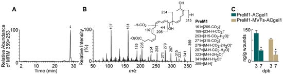 The PreM1-MVFs-ACgel1 treatment described in Section 4.6 was also conducted specifically for this study in parallel to those for the histological assessment of wound healing. These mice were euthanized by decapitation with sharp scissors after deep anesthesia via 5% isoflurane inhalation (three mice at 3 dpb and three mice at 7 dpb). A piece of full-thickness skin containing an excision-debrided 3° burn wound treated with PreM1-MVFs-ACgel1 was harvested using a 12 mm diameter circular biopsy puncture and microsurgery scissors and forceps, weighed, and then submerged in ice-cold 80% acetone containing butylated hydroxytoluene (0.005%) as an antioxidant and deuterium-labeled internal standard prostanglandin-D2-d4 (Cayman Chemical, Ann Arbor, MI, USA), and chilled immediately with liquid nitrogen. Each sample was minced with fine scissors to sub-millimeter pieces, homogenized, and sonicated in the harvesting solvent for extraction, as reported previously [,,]. The extracts were purified via C18-solid-phase extraction and then analyzed using aqueous reversed-phase chiral liquid chromatography tandem mass spectrometry (acLC-MS/MS), as detailed previously [,]. The acLC-MS/MS (TQ-S tandem mass spectrometer coupled to an Acquity LC [Waters, Milford, MA, USA]) used a chiral column (Chiralpak-IA, 150 mm × 2.1 mm × 5 μm; Chiral Technologies, West Chester, PA, USA). The mobile phase was pumped at 0.2 mL/min using the following gradient: 73% A (water:acetic acid = 99.99:0.01) + 27% B (methanol:acetic acid = 99.99:0.01) (0–1 min); ramped to 70.8% A + 29.2% B (1–5 min), to 14.6% A + 85.4% B (5–50 min), and then to 100% B (50–51 min); continued as 100% B (51–56 min); and a final return to 73% A + 27% B. The MeOH solutions from wound extracts were injected into the acLC-UV-MS/MS. The effluent of the chiral LC was atomized by electrospray, and the negatively ionized PreM1 from wound extracts was identified and quantified for comparison with a PreM1 standard using the LC-MS/MS system [,,,].