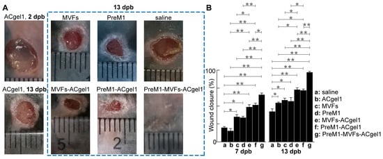 By 13 dpb, some wounds were closed from the initial burns of 0 dpb. The closure percentages were in the following descending order: PreM1-MVFs-ACgel1, MVFs-ACgel1, PreM1-ACgel1, MVFs, PreM1, ACgel, and saline (Figure 2). The wound closure following treatment with PreM1-MVFs-ACgel1 was 97% on average, which was significantly greater than in any other group (p < 0.01) (Figure 2B). Wound closure was significantly greater following treatment with PreM1-ACgel, MVF-ACgel1, PreM1, MVFs, or ACgel1 than with saline alone (p < 0.05 or 0.01) (Figure 2B). Wound closure was significantly greater following treatment with PreM1-ACgel1 than with PreM1 or ACgel1 alone (p < 0.05). Wound closure was significantly greater following treatment with MVFs-ACgel1 than with MVFs or ACgel1 (p < 0.05).