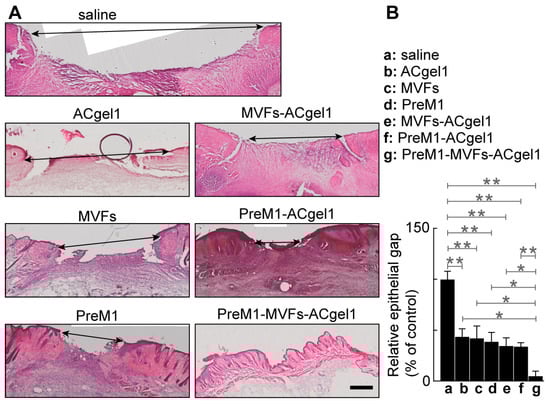 The re-epithelialization of 3° burn wounds was promoted by ACgel1, MVFs, PreM1, MVFs-ACgel1, PreM1-ACgel1, or PreM1-MVFs-ACgel1, while PreM1-MVFs-ACgel1 was most effective. (A) Representative microimages of hematoxylin/eosin (H&E)-stained sections of 3° burn wounds with their margins. Scale bar = 500 µm. Arrow-headed lines mark an epithelial gap. (B) Relative epithelial gap (% of saline control). Full thickness 3° burns were made to the dorsal skin of C57BL/6 mice at 0 dpb, excision-debrided at 2 dpb, treated at 2 dpb with saline (control), ACgel1, MVFs, PreM1, MVFs-ACgel1, PreM1-ACgel1, or PreM1-MVFs-ACgel1, and collected with margins using a biopsy punch and fine scissors. Wound sections were H&E-stained and analyzed with an Olympus scanning microscope. Data are means ± SEM; n = 4. * p < 0.05 and ** p < 0.01.