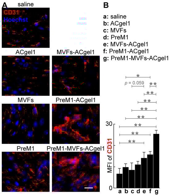 To evaluate the treatments on blood vessel regeneration, we determined the CD31+ blood vessels of excision-debrided 3° burn wounds under each treatment by immuno-fluorescent histology (Figure 4). The cryosections of 3° burn wounds possessed significantly higher mean fluorescence intensity (MFI) of CD31+ vascularity (Figure 4), mostly capillary blood vessels (Figure 4A), for the treatment with PreM1-MVFs-ACgel1 (g), PreM1-ACgel1 (f), or MVFs-ACgel1 (e), than for saline control (p < 0.01), indicating significantly more blood vessel regeneration of 3° burn wounds under these treatments. Moreover, the wounds had a higher MFI for CD31+ vascularity in the PreM1-ACgel1 group (f) than in the ACgel1 group (b) (p < 0.05) (Figure 4B), suggesting that ACgel1 interacts with PreM1 to promote blood vessel regeneration in 3° burn wounds. Additionally, the wounds had higher MFI of CD31+ vascularity for the MVFs-ACgel1 group (e) than for the MVFs group (c), although the significance of difference was marginal (p < 0.059) (Figure 4B), which implies that MVFs-ACgel1 could be somewhat more effective than MVFs alone in promoting blood vessel regeneration, and that ACgel1 could interact with MVFs in promoting vascularization in wounds. Furthermore, PreM1-MVFs-ACgel1 (g) was significantly more effective than PreM1-ACgel1 (f) or MVFs-ACgel1 (e) in promoting blood vessel regeneration, as the CD31+ vascularity in wounds was higher for PreM1-MVFs-ACgel1 group (g) than for the PreM1-ACgel1 (f) or MVFs-ACgel1 (e) groups (p < 0.01) (Figure 4). This reflects that PreM1 enhanced MVFs-ACgel1 promotion and MVFs enhanced PreM1-ACgel1 promotion for blood vessel regeneration in 3° burn wounds.