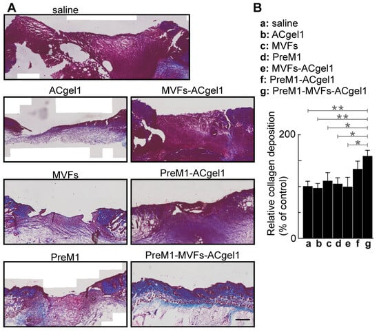 Collagen plays an important role in wound healing [] and skin functions; there-fore, it was evaluated by histochemical analysis in wound sections for each treatment and control. The 3° burn wounds were filled with more collagen, presented as blue Masson-trichrome stain, in the MVFs-PreM1-ACgel1 (g) group than in saline control (a) and ACgel1 (b) groups (p < 0.01), in the MVFs (c), PreM1 (d), and ACgel1+MVFs (e) (p < 0.05) (Figure 5). Burns treated with PreM1- MVFs-ACgel1 (g) also possessed better-organized collagen and extracellular matrix when compared to wounds treated with saline or other treatments (Figure 5A). The 3° burn wounds of the saline control (a) exhibited poor collagen deposition and an immature extracellular matrix (Figure 5A). These data indicate that the combined incorporation of PreM1, MVFs, and ACgel1 into a novel construct of PreM1-MVFs-ACgel1 can promote collagen formation, which is an important response required for the healing of 3° burns. Notably, the collagen levels in 3° burn wounds were higher when treated with PreM1-ACgel1 or MVFs than with the saline control, although the difference was not statistically significant (Figure 5).