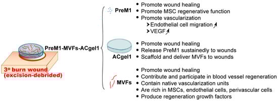 The ideal niche for MVF regenerative functions should provide PreM1 (due to the mentioned PreM1 bioactions) and a housing for MVFs. The half-life of PreM1 in wounds is 1 to 2 h, which limits its utility as a functionalizer for MVFs. However, the inclusion of PreM1 in hydrogels (gels) could conceivably provide protection from degradation, while also offering sustained PreM1 release to the wound. Hydrogels, which consist largely of biological fluid and structurally resemble the natural extracellular matrix, can provide three-dimensional (3D) networks that can function as 3D scaffolds for MVFs to promote wound healing [,,,,,,,,,,]. In addition, the gels may provide interim replacement of burn-destroyed dermis and promote neodermis growth, while also covering wounds as a conventional primary dressing for burns.
