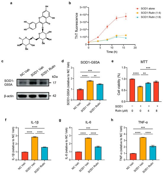 Rutin reduced superoxide dismutase 1 (SOD1)-induced cytotoxicity and neuroinflammation. (a) The structural formula of rutin. (b) The aggregation kinetics of G93A SOD1. The aggregation state of 50 μM of SOD1 was assessed by a Thioflavin T (ThT) fluorescence assay with or without the incubation of 200 or 400 μM of rutin. (c) A Western blot analysis of SOD1 in NSC-34 cells. The cells were transfected with an empty vector (NC-Veh) or a plasmid expressing G93A SOD1 and treated with 8 μM of rutin (SOD1 Rutin) or the vehicle (SOD1 Veh). The SOD1 levels in the cells were analyzed using a Western blot 72 h after transfection. (d) Quantification of SOD1 levels in (b); n = 3 independent experiments. (e) The viability of the NSC-34 cells, determined by an MTT assay. The cells were challenged with 1 μM of SOD1 oligomer or PBS, then the cells were treated with 4 μM or 8 μM of rutin or the vehicle; n = 3 independent experiments. (f–h) Inflammatory cytokine levels in primary microglial culture medium. The primary microglia were treated with 1 μM of SOD1 oligomers in the presence (SOD1 Rutin) or absence (SOD1 Veh) of 8 μM of rutin or treated with PBS (NC Veh) for 48 h, then the levels of IL-1β (f), IL-6 (g), and TNF-α (h) in the culture supernatants were measured by an ELISA; n = 3 independent experiments. The data represent the mean ± SEM and were analyzed by a one-way ANOVA followed by a Tukey’s test (d–h). **, p < 0.01; ***, p < 0.001; and ****, p < 0.0001.