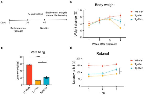 Rutin rescued motor dysfunction in SOD1-G93A mice. (a) Schematic diagram of pharmacological treatments and experimental measurements in SOD1-G93A mice. (b) The body weights of SOD1-G93A mice treated with (Tg-Rutin) or without rutin (Tg-Veh) and their WT littermates treated with the vehicle (WT-Veh) monitored weekly from 1 to 4 weeks after the treatment; n = 8 independent animals. (c) The latency to fall of mice during the wire hang test; n = 8 independent animals. (d) The latency to fall of mice during the rotarod test; n = 8 independent animals. The data represent the mean ± SEM and were analyzed by a one-way ANOVA followed by a Tukey’s test (c) or a two-way ANOVA followed by a Tukey’s test (b,d). *, p < 0.05; and ****, p < 0.0001.