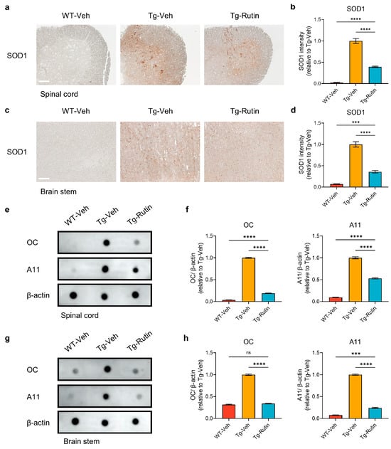 Under pathological conditions, SOD1 abnormally accumulates and forms aggregates, exerting toxic effects []. In the ventral horn of the spinal cord and the brainstem of the SOD1-G93A mice, there was a significant presence of SOD1 aggregates detected by SOD1 immunostaining, whereas the rutin treatment significantly reduced the level of the SOD1 aggregates (Figure 3a–d).