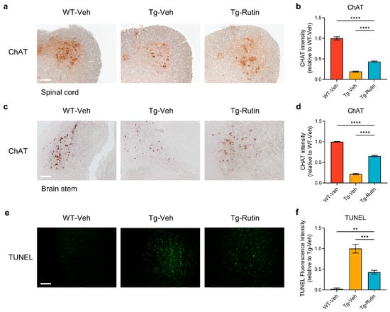 One of the neuropathological hallmarks of ALS is the loss of motor neurons. We assessed the number of motor neurons in the ventral horn of the spinal cord and the brainstem of the SOD1-G93A mice. Th immunohistochemical results revealed that the SOD1-G93A mice exhibited a significant reduction in the levels of choline acetyltransferase (ChAT), a motor neuron marker in the spinal cord and brainstem, indicating a substantial loss of motor neurons. The treatment with rutin significantly restored the levels of ChAT in the spinal cord and brainstem (Figure 4a–d). Furthermore, we utilized the TUNEL assay to analyze the occurrence of apoptosis in the spinal cord of the mice. The results indicated that the treatment with rutin reduced the level of apoptosis in the spinal cord of the SOD1-G93A mice (Figure 4e,f).