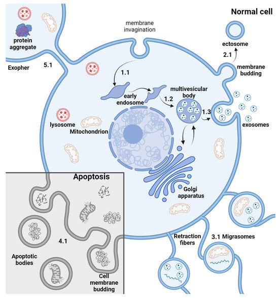 The biogenesis of extracellular vesicles. Exosome biogenesis: 1.1 Early endosome forms from cell membrane invagination. 1.2 During the maturation process, membrane invaginations form on endosomal membrane, which subsequently bud into endosomal lumen, becoming intraluminal vesicles. 1.3 The multivesicular body fuses with the cellular membrane, releasing exosomes into the extracellular space. Ectosome biogenesis: 2.1 Ectosome biogenesis happens through direct membrane budding and fission. Migrasome biogenesis: 3.1 Migrasomes form on retraction fibers during cellular migration due to interactions with the extracellular matrix. Apoptotic bodies biogenesis: 4.1 Apoptotic bodies from the fragmented cellular membrane during apoptosis. Exopher biogenesis: Exopher forms by cell membrane budding. For a period of time it remains connected to the cell with a nanotube, but it is subsequently disconnected from the cell. 1.1 Early endosomes are formed through the invagination of the cell membrane. 1.2 During the maturation process, membrane invaginations occur on the endosomal membrane, which subsequently bud into the endosomal lumen, resulting in the formation of intraluminal vesicles. 1.3 Multivesicular bodies fuse with the cellular membrane, releasing exosomes into the extracellular space. Ectosome Biogenesis: 2.1 Ectosomes are generated through direct membrane budding and fission. Migrasome Biogenesis: 3.1 Migrasomes form on retraction fibers during cellular migration as a result of interactions with the extracellular matrix. Apoptotic Body Biogenesis: 4.1 Apoptotic bodies arise from the fragmentation of the cellular membrane during apoptosis. Exopher Biogenesis: Exophers are formed by the budding of the cell membrane. For a period, they remain connected to the cell via a nanotube but are subsequently detached from the cell.