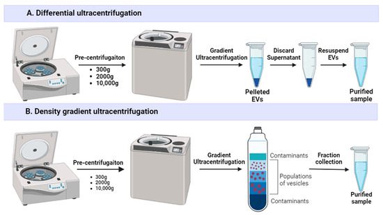 Ultracentrifugation-based EV purification methods. (A) Differential ultracentrifugation begins with several pre-centrifugation steps to remove cells, cell debris, and large non-exosomal vesicles. Subsequently, extracellular vesicles (EVs) are pelleted using an ultracentrifuge. The supernatant, which contains contaminants, is discarded, and the EVs are resuspended in an appropriate buffer. (B) Density gradient ultracentrifugation also involves multiple pre-centrifugation steps to eliminate large contaminants. Following pre-centrifugation, the sample is applied to the density gradient, and ultracentrifugation is conducted. The fraction containing the desired EV population is then collected.