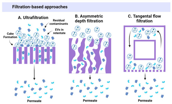 Tangential flow filtration (TFF), also known as cross-flow filtration, is a more sophisticated version of UF that is based on the same principle. However, in the TFF system, the stream flows tangentially across the UF membrane and a second flow is directed through the membrane (Figure 3C). Smaller particles are filtered through the membrane, and larger particles are flushed from the filter by tangential flow. TFF is a cyclic process, and filtration can be repeated several times to increase sample purity or perform buffer exchange. TFF is time-saving, reduces material deposition, provides high EV yields, and allows for vesicle concentration [38,39,40]. TFF can be used to isolate EVs from large volumes (thousands of liters), and it is established as a scalable industrial approach [39]. However, TFF can result in vesicle contamination with large proteins and DNA [18,41], and therefore often requires a second process (e.g., size exclusion chromatography) to obtain optimal EV purity [40].