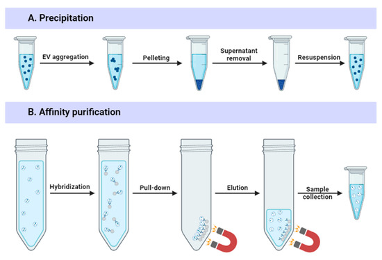 Precipitation and affinity-based EV purification methods. (A) The addition of the cationic polymer induces EV aggregation. The sample is centrifuged, which results in EV pelleting and some of the contaminants residing in the supernatant. The supernatant is subsequently removed and EVs are resuspended in a suitable buffer. (B) During affinity purification, antibodies against EV markers conjugated to the magnetic beads are added to the sample. After the binding of antibodies, the beads are pulled down by magnetic force. The supernatant is replaced by the elution buffer, resulting in the release of the EVs. Afterward, the sample is collected.