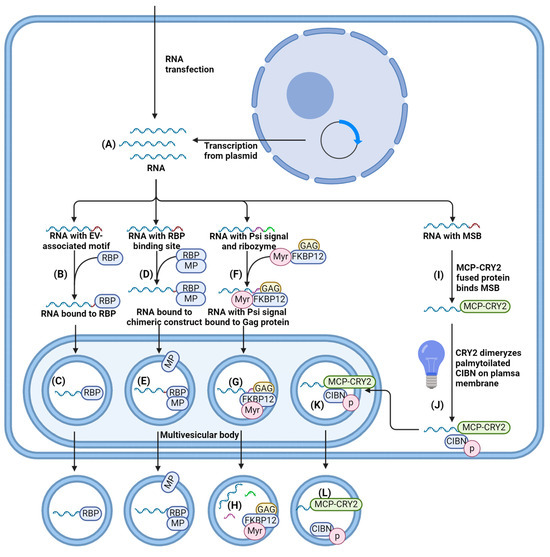Endogenous RNA loading methods. (A) RNA is delivered into the cell via transfection with RNA or a plasmid encoding the RNA. (B) The EV-associated motif in RNA facilitates the binding of EV-associated RNA-binding proteins (RBPs). (C) EV-associated RBPs assist in the sorting of RNA into extracellular vesicles (EVs). (D) A chimeric construct consisting of an RBP and an EV membrane protein (MP) binds to the RBP-binding site in RNA. (E) The RBP-MP complex bound to RNA is sorted to the EV membrane. (F) A chimeric protein consisting of myristoylated FKBP12 and GAG binds to the Psi signal in RNA. (G) Due to myristoylation, the RNA-bound construct is sorted into EVs. (H) A ribozyme encoded in the RNA induces self-cleavage and the release of the RNA. (I) MCP fused to CRY2 binds to the MSB site in the RNA. (J) Blue light induces the dimerization of CRY2 with palmitoylated CIBN, which is enriched on the cell membrane. (K) The dimer bound to RNA is sorted into the EV. (L) In the absence of blue light, the dimer disassembles.