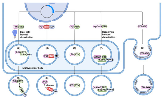 Endogenous protein loading methods. (A) The protein of interest (POI) is fused with CRY2. Upon exposure to blue light, the POI-CRY2 complex dimerizes with CIBN, which is fused to an EV membrane protein (MP). (B) In the absence of blue light, the dimer disassembles, releasing the protein into the EV lumen. (C) The chimeric protein, consisting of the POI, a self-cleaving intein, and the MP, is sorted into the EV. (D) The intein cleaves the construct, releasing the POI into the EV lumen. (E) Post-translational modifications (PTMs), such as myristoylation or palmitoylation, facilitate the sorting of the protein into EVs. (F) Rapamycin induces the dimerization of SpCas9-FRB with FKBP-VSV-g. Due to VSV-g, the construct is sorted into the EV. (G) The POI, fused to a WW signal, binds to ARRDC1, leading to their sorting into ARRDC1-mediated microvesicles.