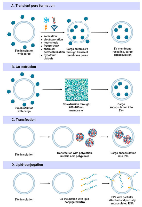 During passive loading, cargo is simply incubated with donor cells or directly with EVs. This technique can be used to load small molecules, particularly hydrophobic small-molecule drugs. However, the incubation method is rarely used due to its low loading efficiency [111] and poor reproducibility [112]. Other methods are categorized as active loading techniques, and include sonication, electroporation, freeze-thawing, transfection, and extrusion.
