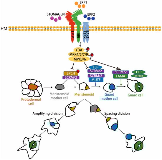 Stomatal formation causes the protodermal cells to acquire the fate of meristemoid mother cells (MMCs: gray). An MMC undergoes an asymmetric entry division and gives rise to two daughter cells, meristemoid (M: yellow) and stomatal-lineage ground cells (SLGC: white). M carries out a limited number of asymmetric amplifying divisions to increase the number of SLGCs while concurrently engaging in self-renewal processes. Finally, M differentiates into the guard mother cell (GMC: blue). Each GMC symmetrically divides to yield a pair of guard cells (GC: green). SLGCs can also acquire the MMC fate and undergo asymmetric division to produce satellite meristemoids that are oriented away from preexisting stomata or precursors. SLGCs terminally differentiate into pavement cells. An SPCH-SCRM bHLH module regulates the initiation of stomatal formation. An MUTE-SCRM-FLP module promotes differentiation of the GMC and coordinates the occurrence of a single symmetric cell division. Meanwhile, an FAMA-SCRM module, along with FLP and MYB88, restricts the execution of this single symmetric cell division, and FAMA promotes GC morphogenesis [24]. The EPFs-ERf-TMM/SERKs/BAK1 ligand-receptor signal regulates SPCH, MUTE, and FAMA, which restricts entry into stomatal cell lineages and enforces proper asymmetric spacing division, respectively. The activated receptor signal is transduced via the YDA-MKK4/5/7/9-MPK3/6 cascade, which suppresses SPCH, probably suppresses MUTE, and promotes FAMA for respective action during stomatal formation. PM stands for plasmalemma. A dashed black arrow indicates that a direct acting signaling molecule has not yet been discovered, and a straight black arrow indicates a promoting or inhibiting effect.