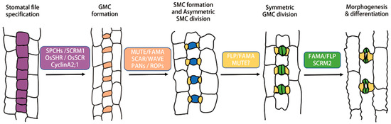 The unique structure of stomata in grass plants requires a distinct developmental process to construct them. Some MMCs with proliferative ability in the leaf base generate an SLGC and a meristemoid cell through an asymmetric entry division. This meristemoid cell does not undergo further divisions but directly differentiates into a GMC. The GMC induces its later epidermal cells to adopt the fate of subsidiary mother cells (SMC). SMC undergoes a directed uneven division to generate an elongated SC. Afterward, the GMC undergoes equal division, forming two rod-shaped GCs. Lastly, the elongated SC transitions into an inverted triangle shape, and the rod-shaped GCs elongate into dumbbell shapes, completing the morphogenesis of stomata and developing into mature stomata [45,46].
