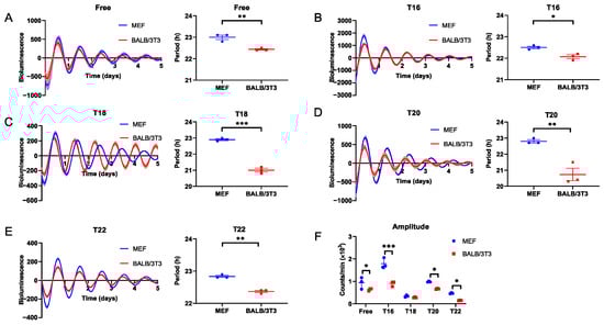 Measurement of the adaptability of MEF and BALB/3T3 cellular circadian rhythms to DEX T cycles < 24 h. (A) Free run; (B) T16; (C) T18; (D) T20; (E) T22. (F) The amplitude of Bmal1 in MEF and BALB/3T3 cells under different T cycles (n = 3; * p < 0.05, ** p < 0.01, *** p < 0.001).