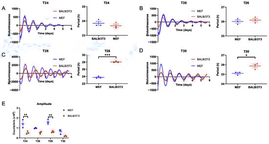 Measurement of the adaptability of MEF and BALB/3T3 cellular circadian rhythms to DEX T cycles ≥ 24 h. (A) T24; (B) T26; (C) T28; (D) T30. (E) The amplitude of Bmal1 in MEF and BALB/3T3 cells under different T cycles (n = 3; * p < 0.05, ** p < 0.01, *** p < 0.001).