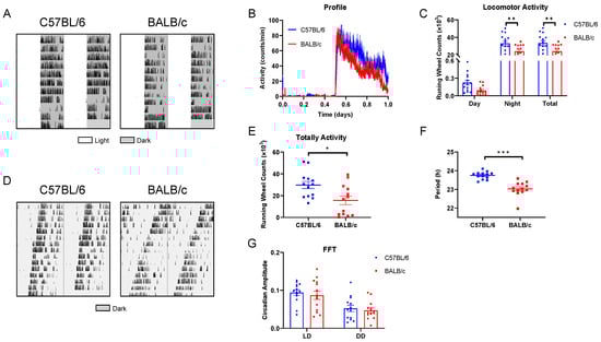 The basal behavioral rhythm in C57BL/6 and BALB/c mice. (A) Representative double-plotted actograms of wheel running activity of C57BL/6 and BALB/c mice in LD cycle. (B) The average 10-day diurnal activity profile in LD cycles. (C) Daytime, nighttime, and total activity levels. (D) Double-plotted actograms of wheel running activity of C57BL/6 and BALB/c mice in DD condition. (E) Totally activity in DD. (F) FRP. (G) The FFT in LD and DD (n = 14; * p < 0.05, ** p < 0.01, *** p < 0.001).
