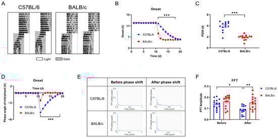 The entrainment of C57BL/6 and BALB/c mice to the +6 shift. (A) Representative double-plotted actograms of wheel running activity of mice treated with the + 6 shift. The white bar represents the day, and the gray bar represents the nighttime. (B) Quantified activity onsets. (C) PS50 values are calculated by activity onset. (D) Phase angle of entrainment. (E) FFT relative power for 7 days before and after the shift. (F) The amplitude of circadian behavior revealed by FFT relative power (n = 14; * p < 0.05, ** p < 0.01, *** p < 0.001).