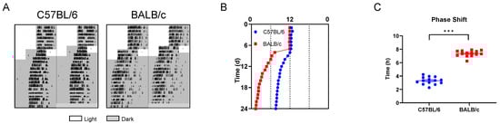 Mice are the most generally employed mammalian model for investigating circadian rhythm, which is influenced by various characteristics including age, gender, and strain [8]. Evidence revealed that the free-running period (FRP) in constant darkness (DD), which reflects the endogenous circadian clock of nocturnal animals, in BALB/c mice, is typically significantly shorter than that in C57BL/6 mice [9]. In addition, the circadian behavior of BALB/c mice is more flexible in entrainment to various light/dark cycles compared to C57BL/6 mice [10,11]. However, most research on the adaptability differences in circadian clocks from two distinct genetic backgrounds has focused on behavioral rhythms, with scant attention devoted to the cellular level, and the underlying molecular mechanisms remaining elusive.
