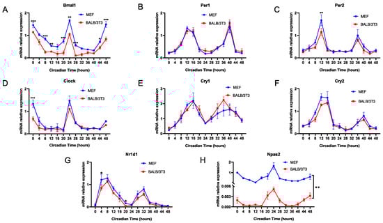 Expression rhythms of core clock genes in MEF and BALB/3T3 cells. (A) Bmal1; (B) Per1; (C) Per2; (D) Clock; (E) Cry1; (F) Cry2; (G) Nr1d1; (H) Npas2 (n = 3; * p < 0.05, ** p < 0.01, *** p < 0.001).