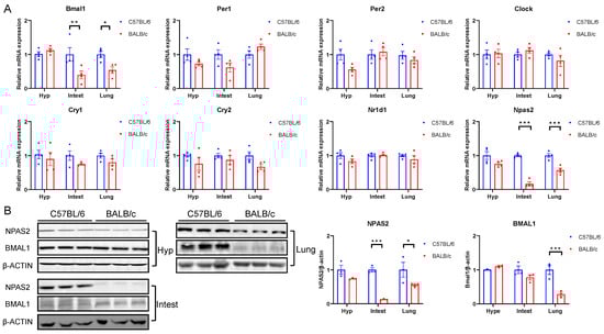 Expression of core clock genes in C57BL/6 and BALB/c mice tissue. (A) mRNA (n = 4) and (B) western blotting (n = 3) and corresponding data statistics for expression of core clock genes in the hypothalamus, intestine, and lung (* p < 0.05, ** p < 0.01, *** p < 0.001).