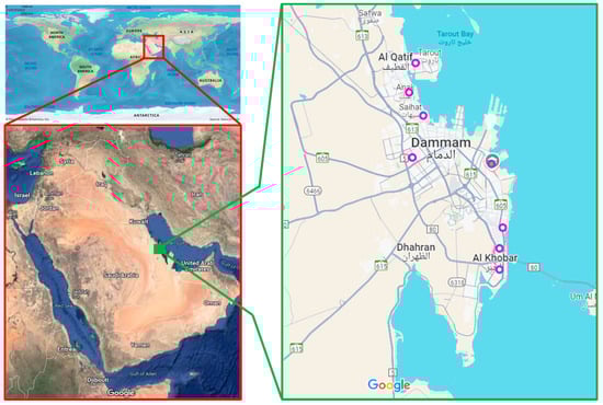 The map displays the geographic location (circled in pink) of the collected samples, including the institute garden (circled in pink-filled green) soil where AQ11M9 was isolated [Courtesy: Encyclopædia Britannica, Inc. (Edinburgh, UK) https://www.britannica.com/science/world-map; Google Maps https://www.google.com/maps (accessed on 17 September 2024).