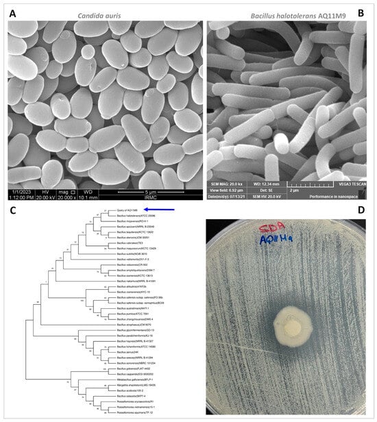 (A) Electron-microscopic structure of Candida auris (3.083 ± 0.225 × 1.995 ± 0.132 µm) used for the study. Scale bar: 5 μm. (B) Electron-microscopic structure of B. halotolerans AQ11M9 (2.629 ± 0.151 × 0.675 ± 0.032 µm). Scale bar: 2 μm. (C) Phylogenetic tree of B. halotolerans AQ11M9. Blue arrow indicates the 16S rRNA gene sequence of the query AQ11M9. (D) Anti-Candida auris activity of B. halotolerans AQ11M9 with zone of inhibition, 21 to 23 mm. SDA: Sabouraud dextrose agar.