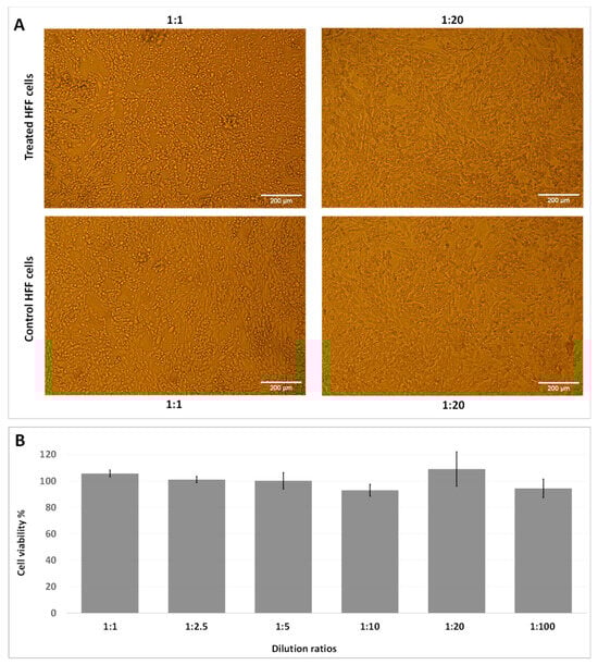 This assessment was carried out by employing the tetrazolium substrate MTT (Sigma-Aldrich (St. Louis, MO, USA), cat. no. M2128) []. The HFF-1 cells were cultured in a 96-well plate at a concentration of 1 × 104 cells/mL and were incubated for 24 h prior to exposure to bacterial filtrates. The treatment involved the utilization of filtered broth, whereas a control was established using sterile TSB. Various dilutions of Dulbecco’s Modified Eagle’s Medium (DMEM) and broth were made with the intention of attaining dilution ratios of 1:1, 1:2.5, 1:5, 1:10, 1:20, and 1:100. These dilutions were thereafter incubated with the cells for a duration of 48 h. Then, cells were rinsed with 1× phosphate-buffered saline and the culture medium was substituted with fresh DMEM. Subsequently, 10 µL of MTT reagent was introduced to each well and the cells were maintained at a temperature of 37 °C in a 5% CO2 incubator. The measurement of absorbance was conducted using a multimode plate reader (Biotek (Charlotte, VT, USA)) at a wavelength of 570 nm. The statistical significance between the exposure group and the control group was examined through the utilization of one-way analysis of variance (ANOVA) with a subsequent post hoc Tukey HSD test.