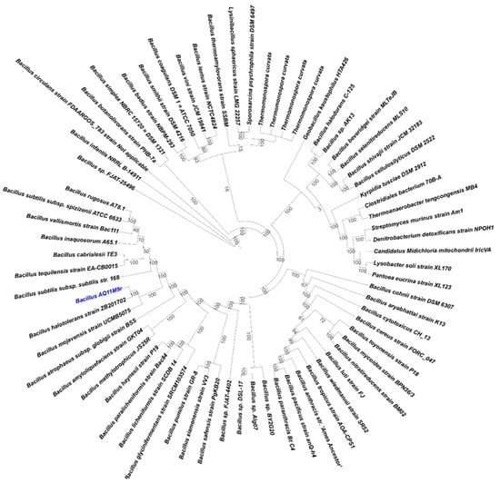 Phylogenetic analysis of AQ11M9 based on the sequence of 16S rRNA gene extracted from the AQ11M9 genome specified that the AQ11M9 strain formed a lineage within the species B. halotolerans and B. mojavensis and clustered as members of the genus Bacillus. To ensure the most similar species, a phylogenetic tree of the AQ11M9 genome was created using PATRIC comparing B. halotolerans and Bacillus mojavensis through a 100-gene alignment request; however, 51 single-copy genes were found in the AQ11M9 genome and 65 reference genomes (Figure 4). This revealed that the AQ11M9 genome is closely related to B. halotolerans. To further determine the taxonomic affiliation of AQ11M9, the whole genome of AQ11M9 was uploaded to TYGS for AQ11M9-genome-based taxonomic classification, which assigned B. halotolerans as the expected organism of the AQ11M9 strain. However, when the sequence was analyzed using PATRIC and EPI2ME, it was identified as being very similar to the unclassified PAMC26543 strain followed by the B. halotolerans V84-19 strain (Figure S1), suggesting that AQ11M9 could be a new strain of B. halotolerans based on these different results. For more confirmation, the comparison between these three organisms was carried out based on genome regions and genome proteome.
