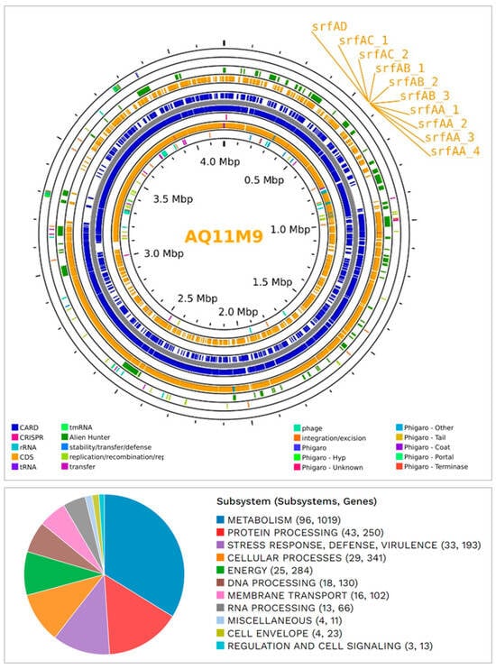 (Top) Circular genome map for genome information of B. halotolerans AQ11M9. The gene clusters associated with surfactin biosynthesis were identified in the genome of strain AQ11M9 are indicated. (Bottom) Functional annotation of the AQ11M9 genome.