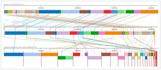The contiguous sequence of the AQ11M9 genome was utilized for circular genome mapping. This mapping was performed to illustrate the subsystem, function, and overall characteristics of the AQ11M9 sequence (Figure 5 and Figure S2). The genomic similarities between the AQ11M9 strain and two species, namely the unclassified PAMC26543 and the B. halotolerans V84-19 strain, prompted us to conduct a comparative analysis of their genomes. Figure 5 displays the MAUVE comparison of three entities, namely AQ11M9, PAMC26543, and the B. halotolerans V84-19 strain. Moreover, the genome comparison showed that synteny blocks among the AQ11M9, PAMC26543, and B. halotolerans V84-19 strain are longer, with regions containing conserved household genes and showing high nucleotide conservation. However, the beginning of the chromosomal regions revealed variable genes with biosynthetic clusters (Figure 6 and Figure S2). The synteny blocks and homologous locally collinear blocks between genomes AQ11M9, B. halotolerans strain V48-19, and PAMC26543 indicate that AQ11M9 is neither completely similar to PAMC26543 nor to the B. halotolerans V84-19 strain, while the proteome comparison showed similarity but not 100% similarity (Figure S3). Closer review revealed that chromosomal regions with variable genes (Figure 7) contain surfactin gene clusters (Figure S2A), fengycin, plipastatin, and mycosubtilin gene clusters (Figure S2E).