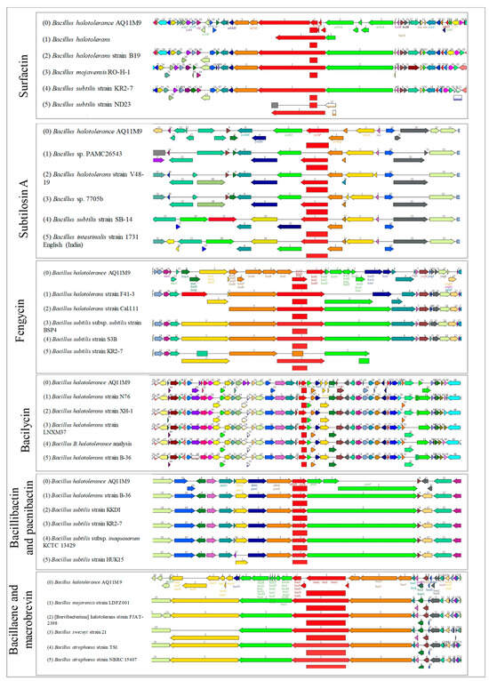 Genetic organization of the identified putative BGCs in genome of B. halotolerans AQ11M9 using PATRIC. Conservation of six clusters in the genome of B. halotolerans AQ11M9 with other species in the same genus. The orientation of the gene in BGCs is indicated by the direction of the arrow, representing both the forward and reverse orientations.