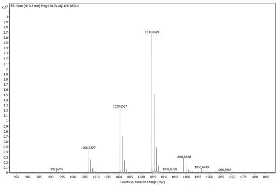 Preliminary validation of the biosynthetic gene-associated products detected using genome mining was carried out on the cell-free broth of AQ11M9 using LC/MS. The secondary metabolite produced by B. halotolerans AQ11M9 analyzed using LC/MS revealed the presence of surfactin-like molecules with a mass-to-charge ratio = 1034.6699 m/z (Figure 8) and a corresponding molecular weight = 1036.3 g/mol.