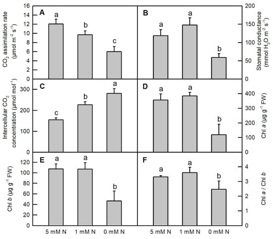 Effects of different nitrogen treatments on CO2 assimilation rate (A); stomatal conductance ((B) n = 6); internal CO2 concentration ((C) n = 6); chlorophyll a (Chl a, (D) n = 3), Chl b ((E) n = 3) and the ratio of Chl a to Chl b (Chl a/Chl b (F) n = 3) in O. sativa seedlings. Bars represent means ± SD (n = 6). Different letters above the bars represent a significant difference at p < 0.05.