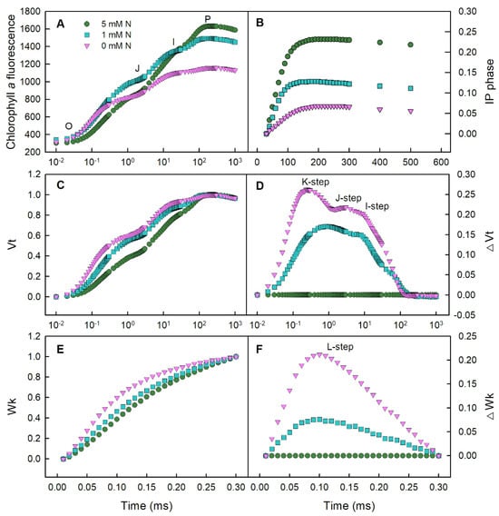 Effects of different nitrogen treatments on the average Chl a fluorescence transient (A); IP phase: (Ft − FI)/(FI − Fo) in dark-adapted O. sativa leaves (B); the relatively variable fluorescence between Fo to Fm: Vt = (Ft − Fo)/(Fm − Fo) (C); the differences in Vt between low-N and N-deficient samples and the control samples (5 mM N) (D); the relatively variable fluorescence between Fo to F300μs: Wk = (Ft − Fo)/(F300μs − Fo) (E); and the differences in Wk between low-N and N-deficient samples and the control samples (5 mM N) (F). Values are represented by the means of six biological replicates.